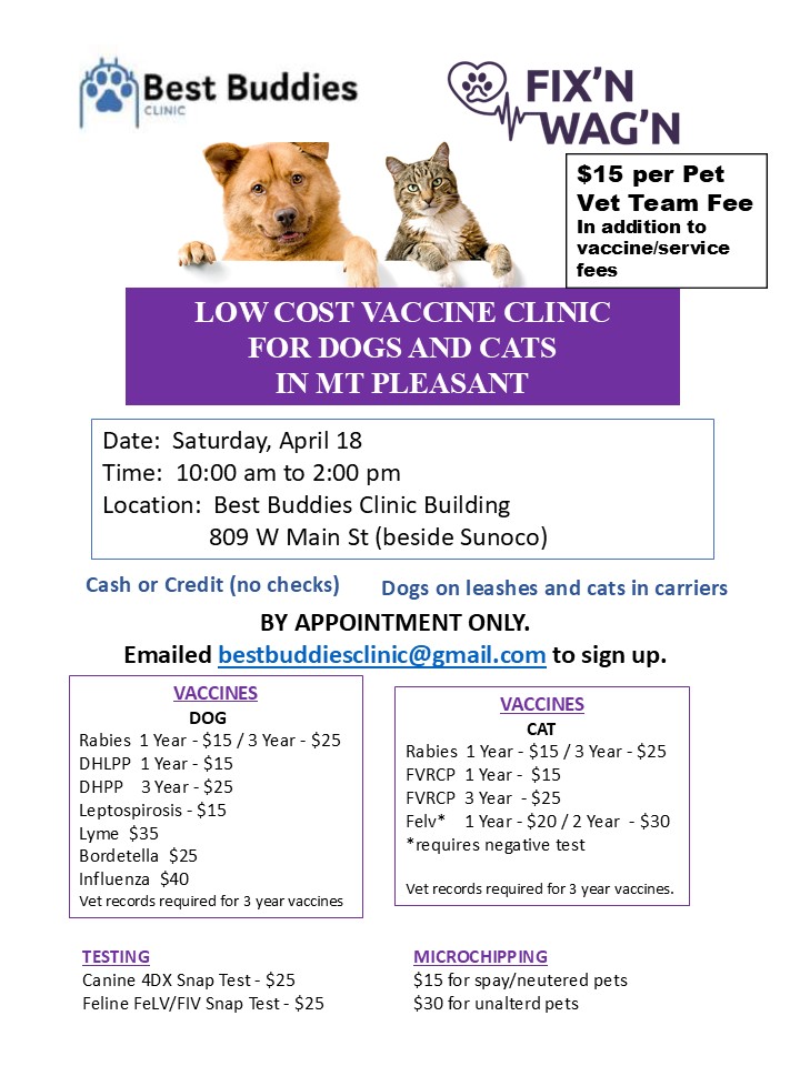 Saturday, April 18 Will be at clinic house: 809 W Main St, Mt Pleasant (beside Sunoco) Note: street parking NOTE: Cost is $100 females and $100 males which is paid fully to Fixn Wagn. We ask for a small donation be added to your payment for Best Buddies to help cover their expenses in making these clinics possible. We suggest $5 for males and $10 for females but any amount is appreciated. Donation is not required. Email to sign up! CATS ONLY.