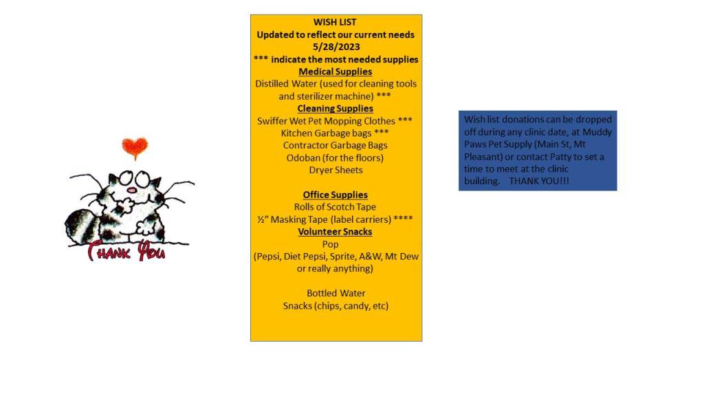 Friday, Feb 6 Will be at clinic house: 809 W Main St, Mt Pleasant (beside Sunoco) Note: street parking NOTE: Cost is $100 females and $100 males which is paid fully to Fixn Wagn. We ask for a small donation be added to your payment for Best Buddies to help cover their expenses in making these clinics possible. We suggest $5 for males and $10 for females but any amount is appreciated. Donation is not required. Email to sign up! CATS ONLY.