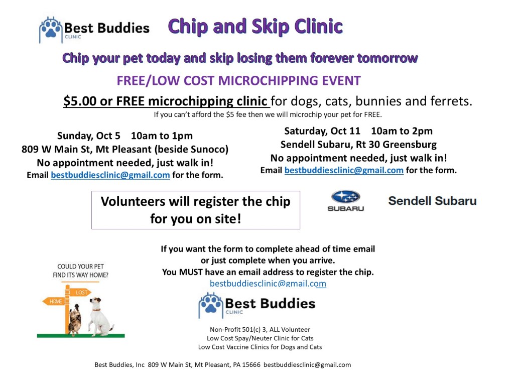 NEW! Low cost microchips at our Chip and Skip clinics. $5 or free, See details for all our clinics below.