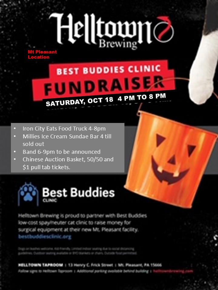 Saturday, Feb 21 Will be at clinic house: 809 W Main St, Mt Pleasant (beside Sunoco) Note: street parking NOTE: Cost is $100 females and $100 males which is paid fully to Fixn Wagn. We ask for a small donation be added to your payment for Best Buddies to help cover their expenses in making these clinics possible. We suggest $5 for males and $10 for females but any amount is appreciated. Donation is not required. Email to sign up! CATS ONLY.