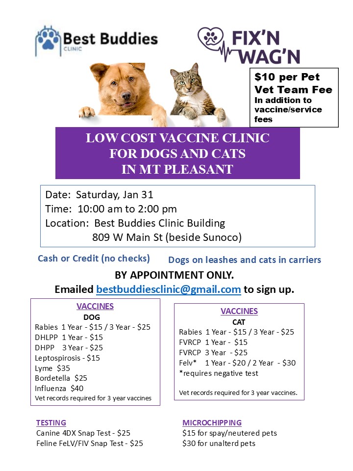 Saturday, Jan 31 (2026) Will be at clinic house: 809 W Main St, Mt Pleasant (beside Sunoco) Note: street parking NOTE: Cost is $100 females and $100 males which is paid fully to Fixn Wagn. We ask for a small donation be added to your payment for Best Buddies to help cover their expenses in making these clinics possible. We suggest $5 for males and $10 for females but any amount is appreciated. Donation is not required. Email to sign up! CATS ONLY. CLINIC IS FULL